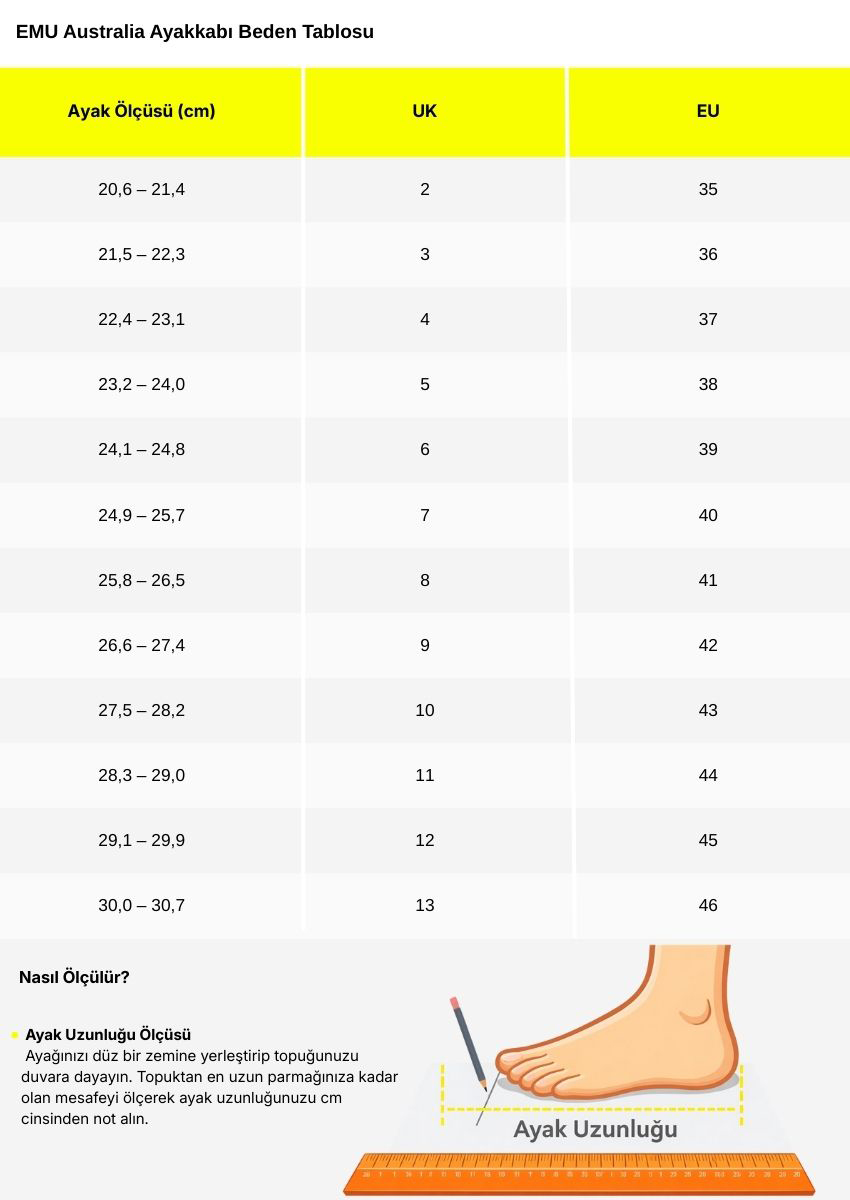 EMU Australia Stinger Micro Bej Kadın Bot, doğal konfor, sıcaklık ve dayanıklılığı bir arada sunan premium bir tasarımdır. Woolmark onaylı %100 saf Avustralya yünü ile her adımda sıcak ve rahat bir kullanım sağlar. Suya dayanıklı ve leke tutmayan gerçek süet deri dış yüzey, hafif yağmurlarda ve dış mekan kullanımında koruma sağlar. Kaymaz kauçuk dış taban, günlük zeminlerde güvenli tutuş ve denge sunar. Sade ve çok yönlü tasarımı ile şehir yaşamı, okul ve günlük kullanım için ideal bir kadın bot seçeneğidir.