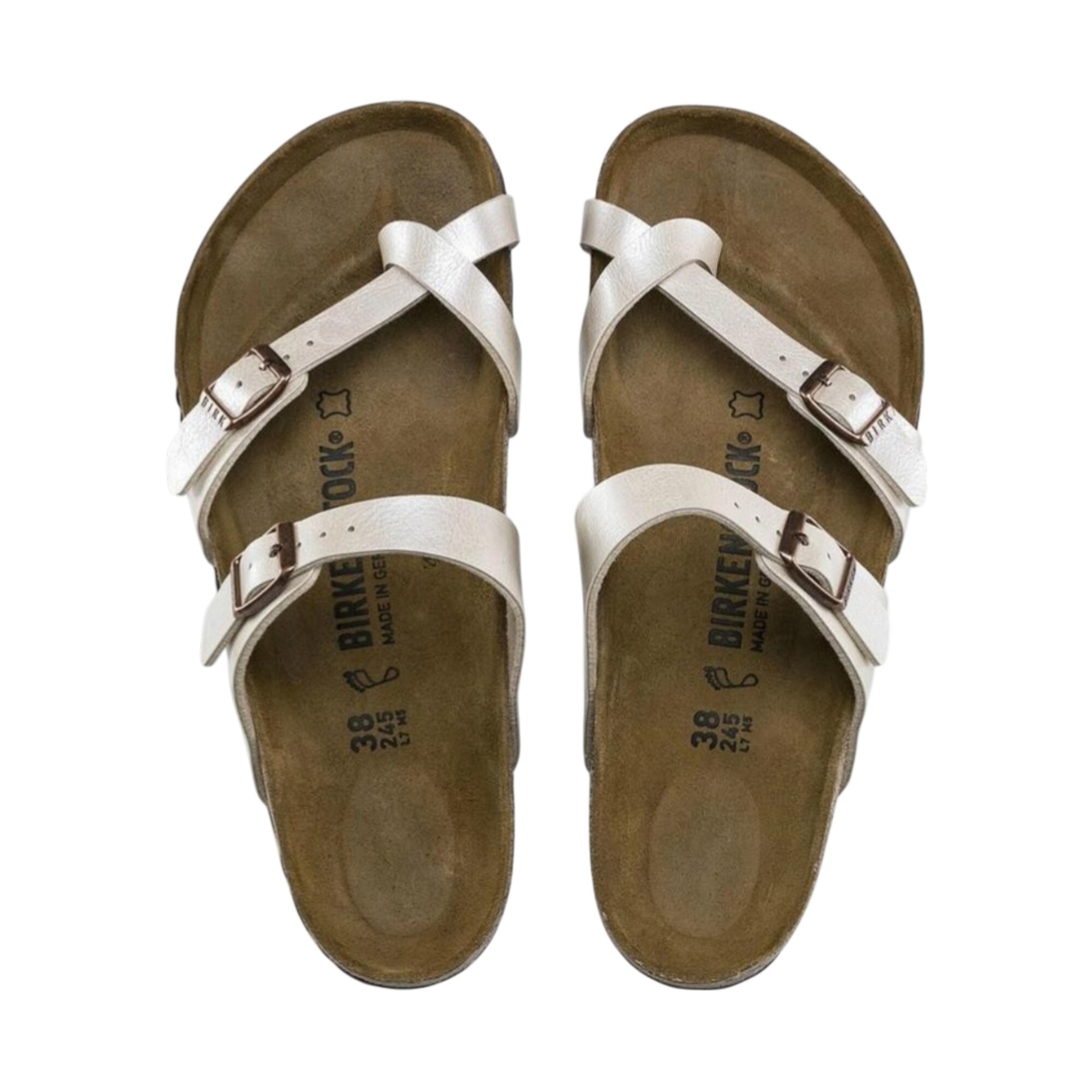 Birkenstock Mayari BF Graceful Beyaz Kadın Terlik, neşeli ve modern tasarımıyla yaz aylarının vazgeçilmezi olmaya aday. İpeksi bir parlaklığa sahip Birko-Flor® üst yüzeyi ile dikkat çeken bu kadın terlik, anatomik mantar tabanı sayesinde ayak sağlığınızı en üst seviyede tutar. Zarif ayak parmağı halkası ve ayarlanabilir metal tokaları, estetik bir görünüm ile ayağı tam kavrayan güvenli bir kullanımı bir arada sunar.