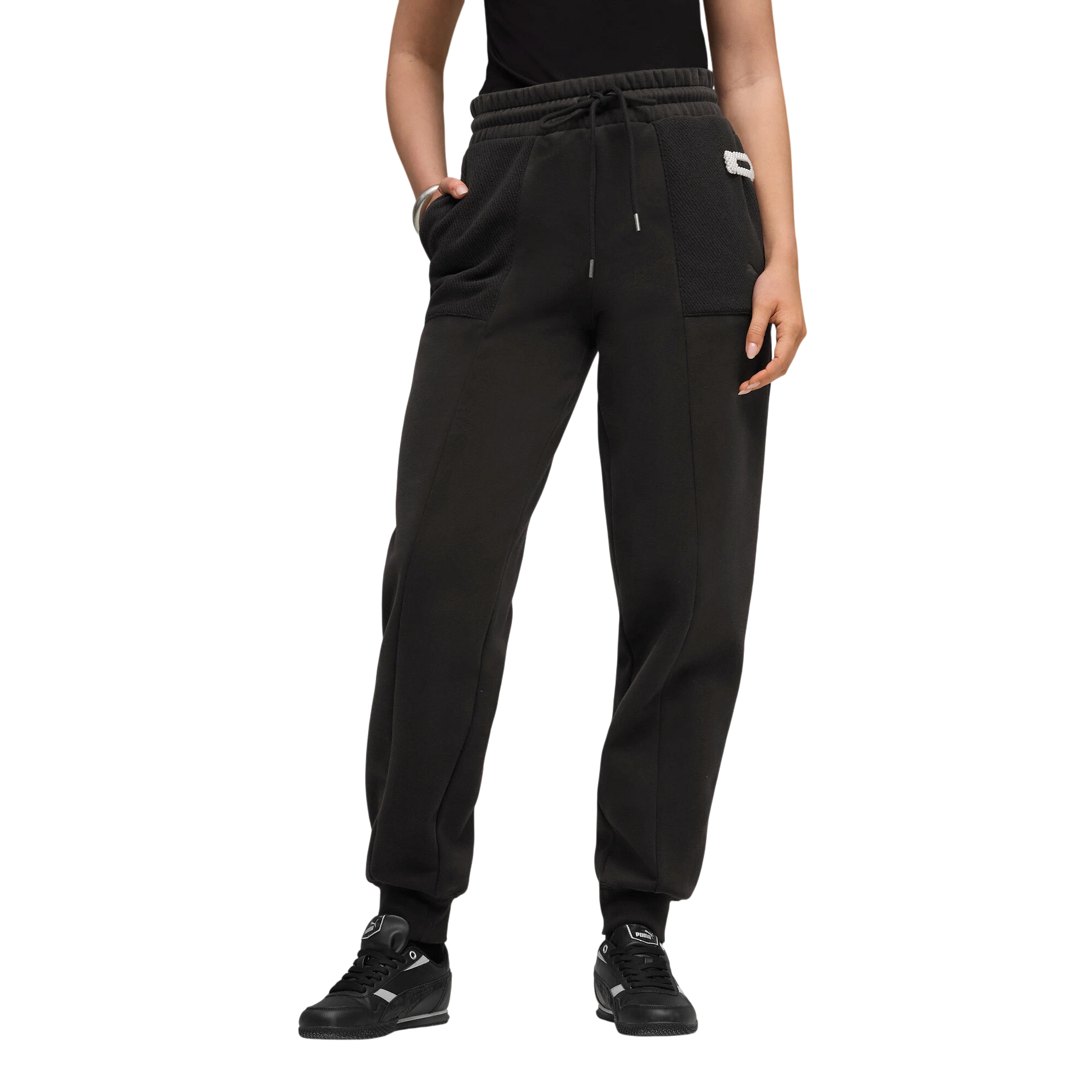 Yüksek bel tasarımı, beli nazikçe sarar ve rahat bir uyum sağlar. Ayarlanabilir bağcıklı elastik bel, kişisel konforunuzu artırır. Ribana manşetler pantolon paçalarının kaymasını engeller. Ön kısımdaki dikiş detayları bacakları uzun gösterirken, yan ceplerin dokulu detayları hem şık hem de pratiktir. Nakışlı Puma Cat logosu, tarzınızı vurgular.