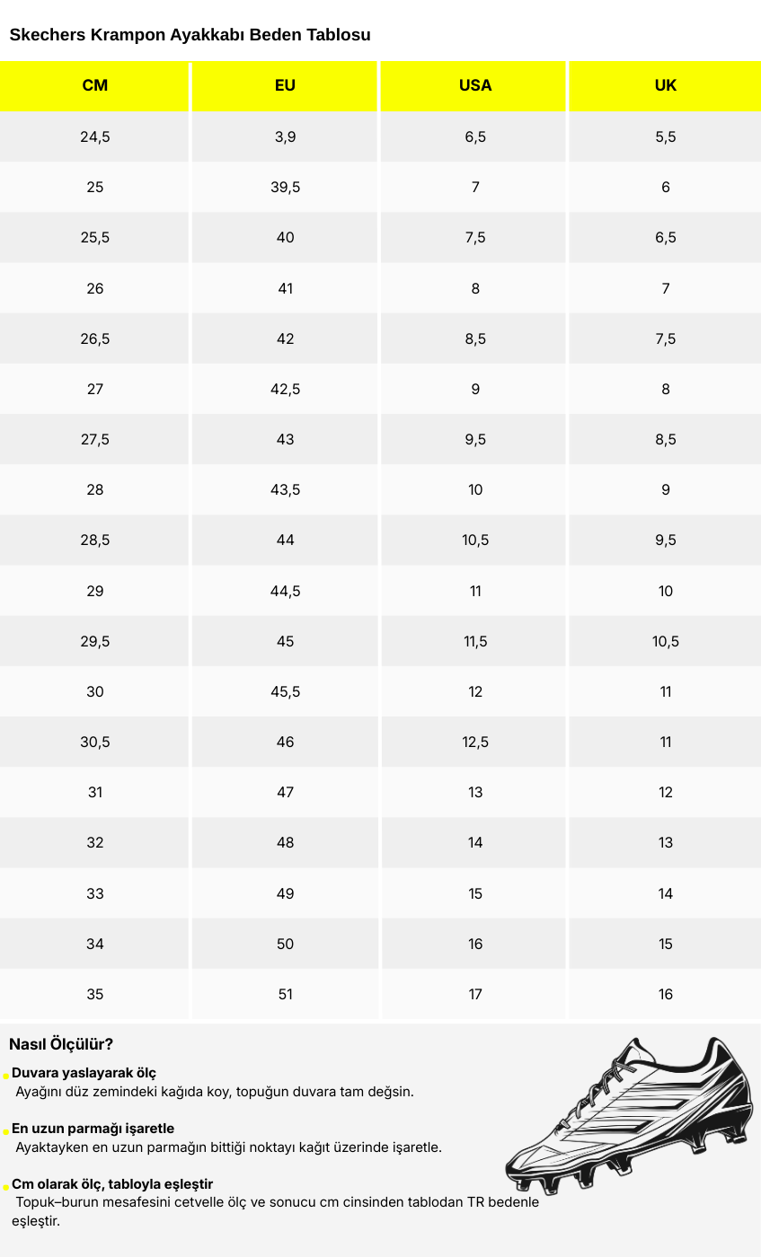 Skechers Razor Gold FG Erkek Krampon, futbol sahalarında konfor ve performansı bir araya getiren yüksek kaliteli bir erkek futbol kramponudur. Hafif Skechers Move Foam™ yastıklamalı iç tabanı, uzun süreli kullanımda ekstra rahatlık sunar ve ayaklarınızın yorgun düşmesini önler. Kauçuk tabanı, her yönde kalkış, duruş ve hızlanma gereksinimlerini karşılayarak güvenilir bir tutuş sağlar. Doğal çim yüzeyler için kramponlu sert zemin tasarımı, sahada maksimum kontrol ve çeviklik sunar. Ultra hafif sentetik üst kısmı, dayanıklılık ve konforu bir arada sunarken, ön bağcıklı tasarımı ayakkabıyı ayağınıza tam oturtmanızı sağlar.